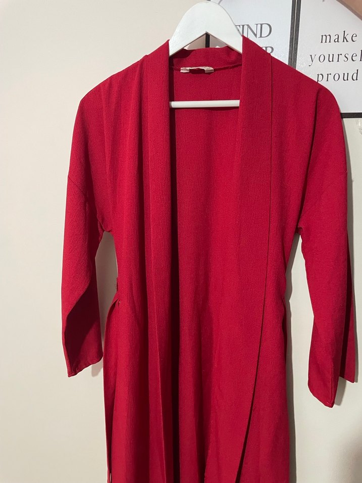 Uzun, koyu kırmızı renkte, bol kesim ve uzun kollu kadın sabahlığı. Minimalist ve desensiz, çağdaş tarzda tasarlanmıştır. ✨