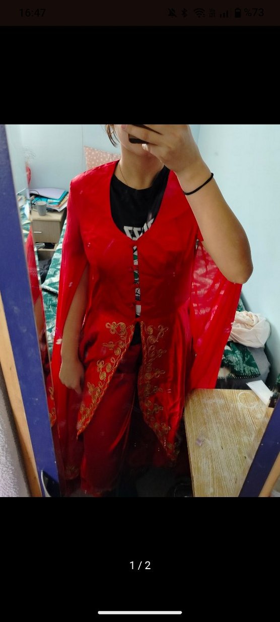 Uzun, bol kesim kırmızı parlak kumaştan, nakışlı ve V yaka, kolsuz bohem tarzda hint elbisesi. Düğün gibi özel anlar için uygun.
