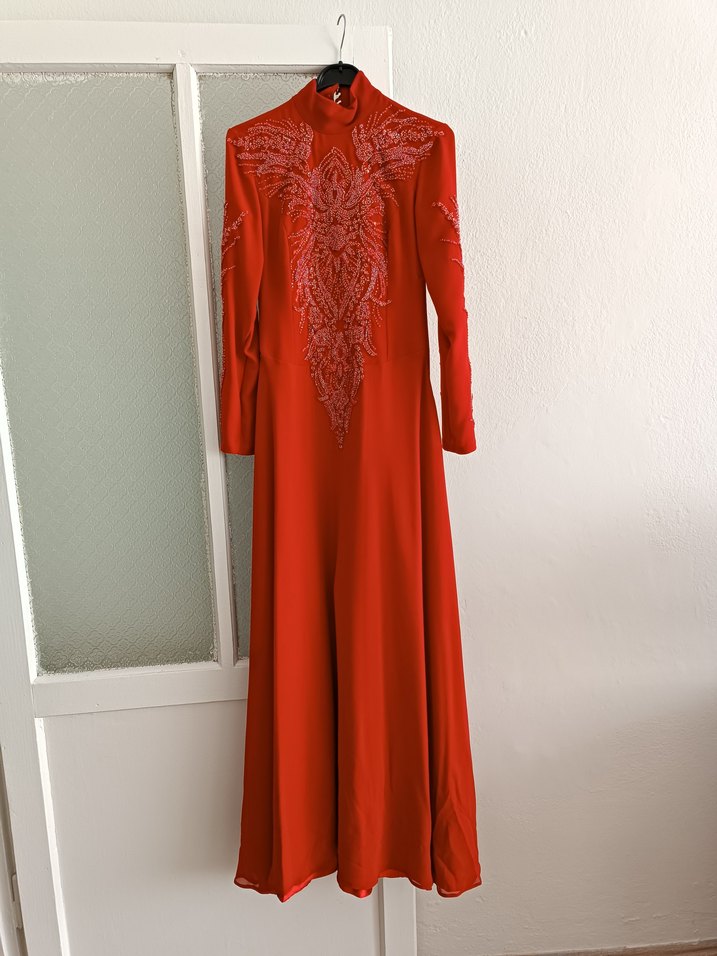 Uzun, kırmızı ve dar kesim henna elbise, yüksek yakalı ve uzun kolludur. Parlak nakış detayları ve drapeli tasarımıyla düğünler için uygundur. tam 38 beden ablamın nikahında kullandım. nedeni olmadığı için kullanamıyorum.