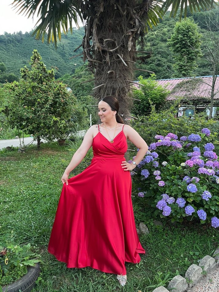 Uzun kırmızı abiye, drapeli ve parlak kumaşıyla dikkat çeker. V yaka ve ince askılı, fit kesimiyle gösterişli ve cesur bir tarz sunar.