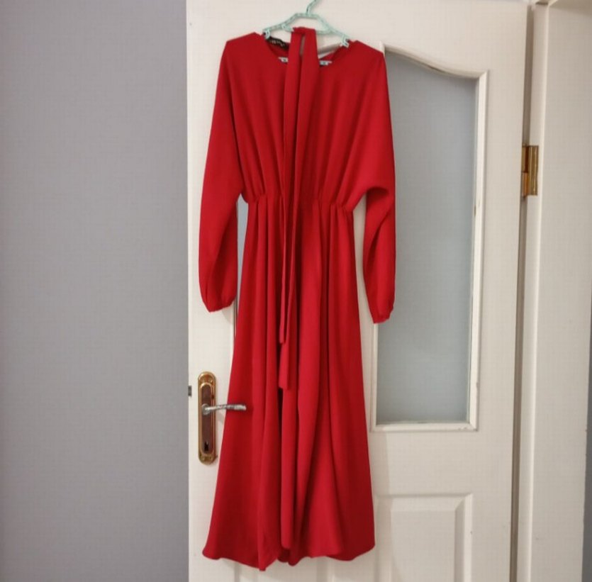 Uzun kırmızı elbise, yüksek yakalı ve uzun kollu, salaş kesimlidir. Drapeli ve yumuşak, sıcak dokuda minimalist tarzda.