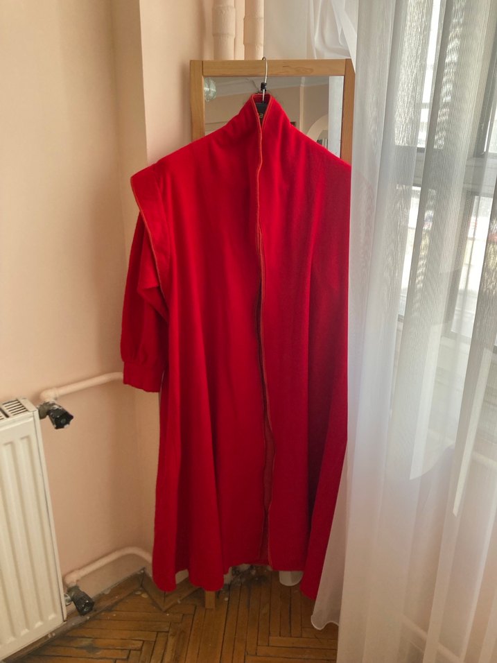 Uzun, kırmızı, salaş kesim kadın kaşe. Uzun kollu, parlak kumaştan ve desensiz, minimalist sokak stili.