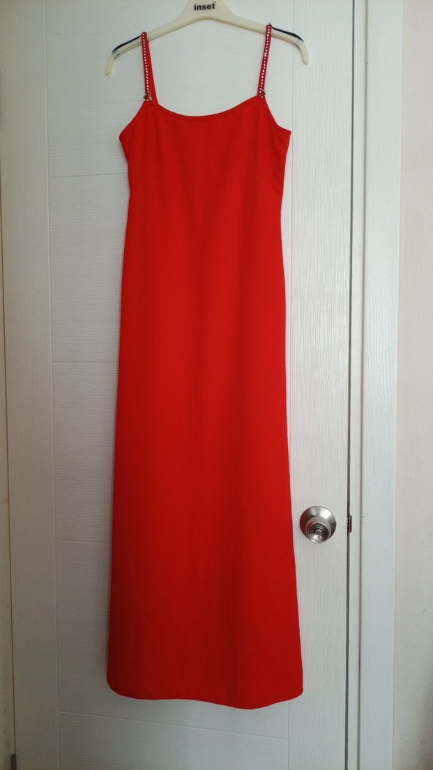 Uzun Kırmızı Saten Askılı Elbise