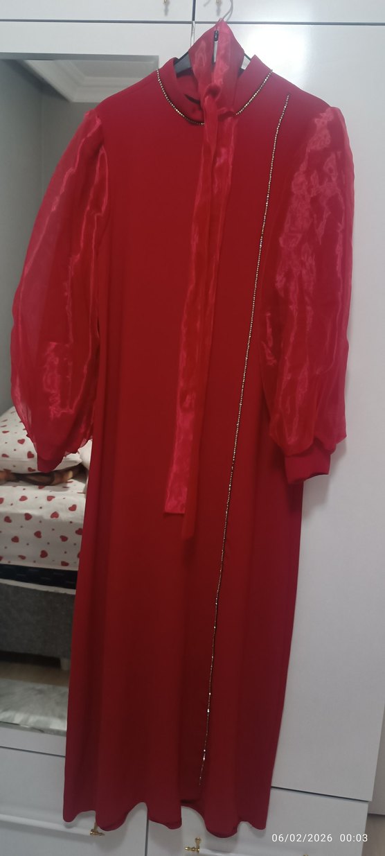 Uzun kırmızı elbise, bol kesim, saten dokulu kumaş, uzun kollu ve yüksek yakalı, düğün için uygun.