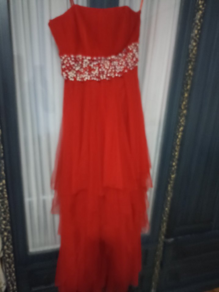 Uzun kırmızı abiye elbise, straplez ve kolsuz. Oturmalı kesimi, drapeli ve işlemeli beliyle düğünlere uygundur.