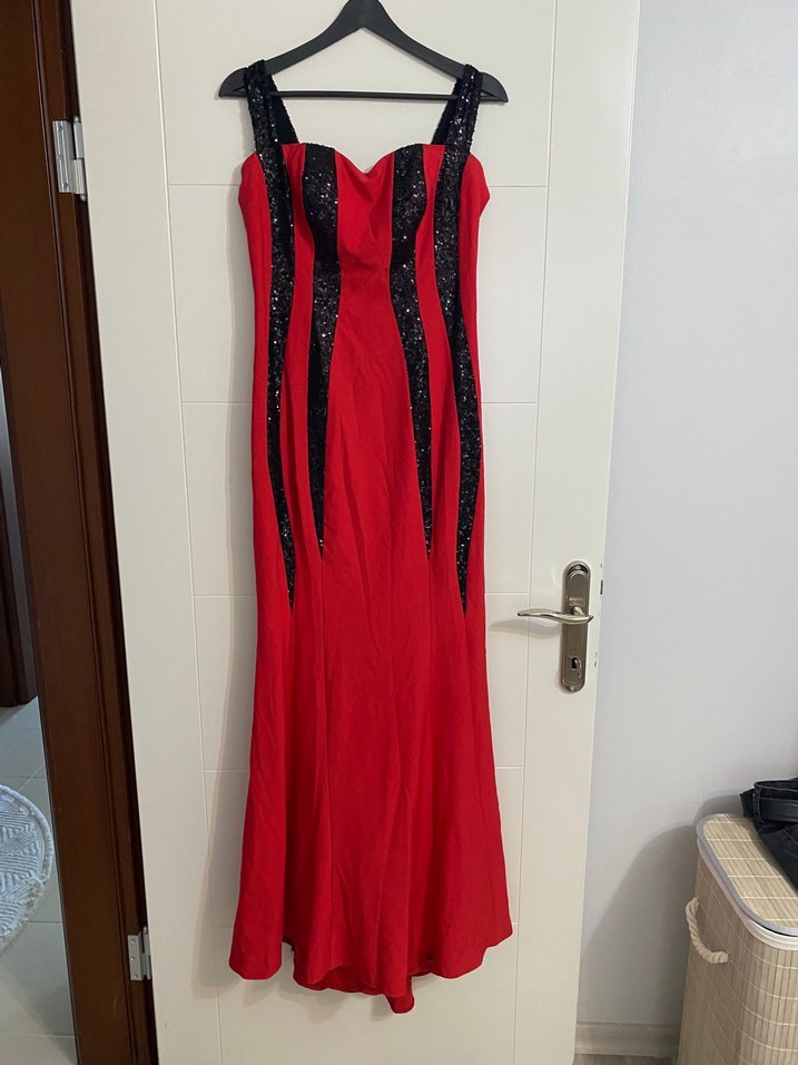 Kırmızı ve siyah nakışlı detaylarla uzun, straplez ve oturan kesim abiye elbise, romantik akşamlar için ideal.