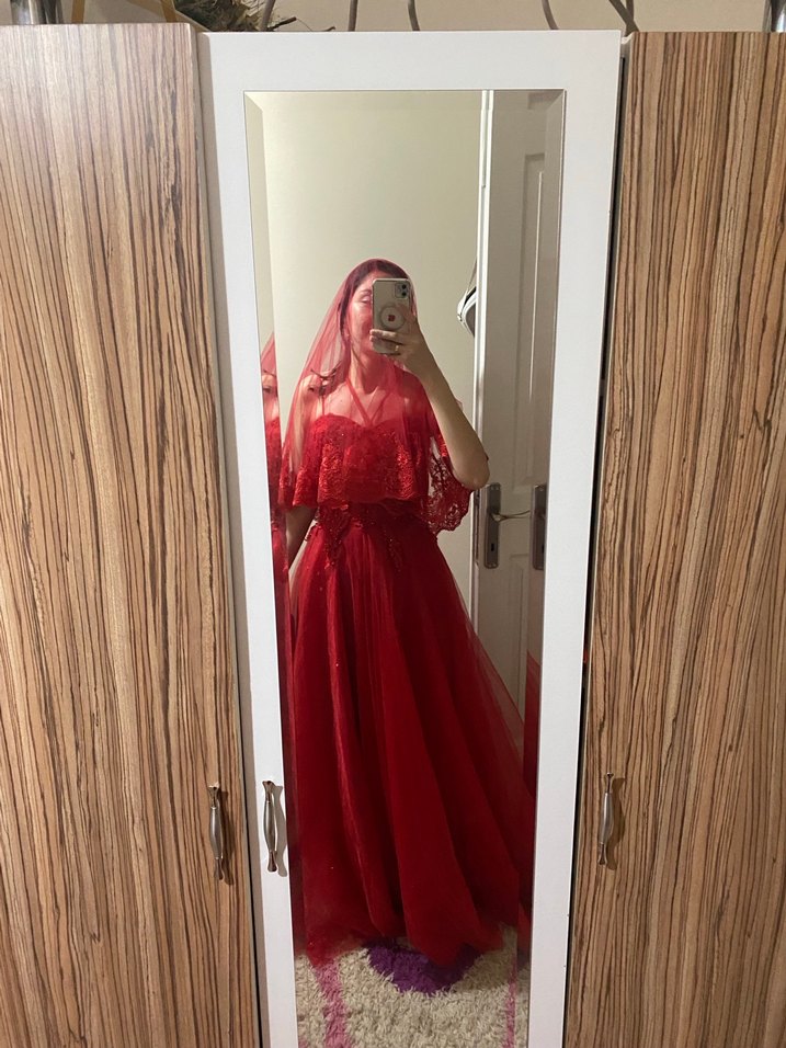 Uzun, kırmızı, transparan uzun kollu ve straplez yakalı dar kesim abiye. Parlak kumaşıyla modern klasik ve gotik şıklık sunar.