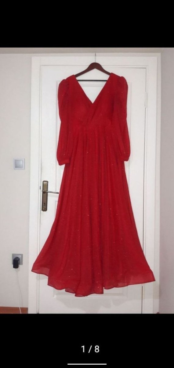 Uzun kırmızı abiye elbise, bol kesim ve drapeli tasarıma sahiptir. V yaka ve uzun kolludur, düğün ve şık etkinlikler için uygundur. Parlak kumaşı bohem tarzı yansıtır.
