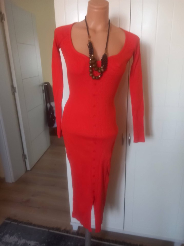 V yaka ve uzun kollu, boncuk işlemeli kırmızı triko elbise. Sıkı kesimiyle cesur ve sokak tarzına uygun. Günlük kullanıma uygundur.
