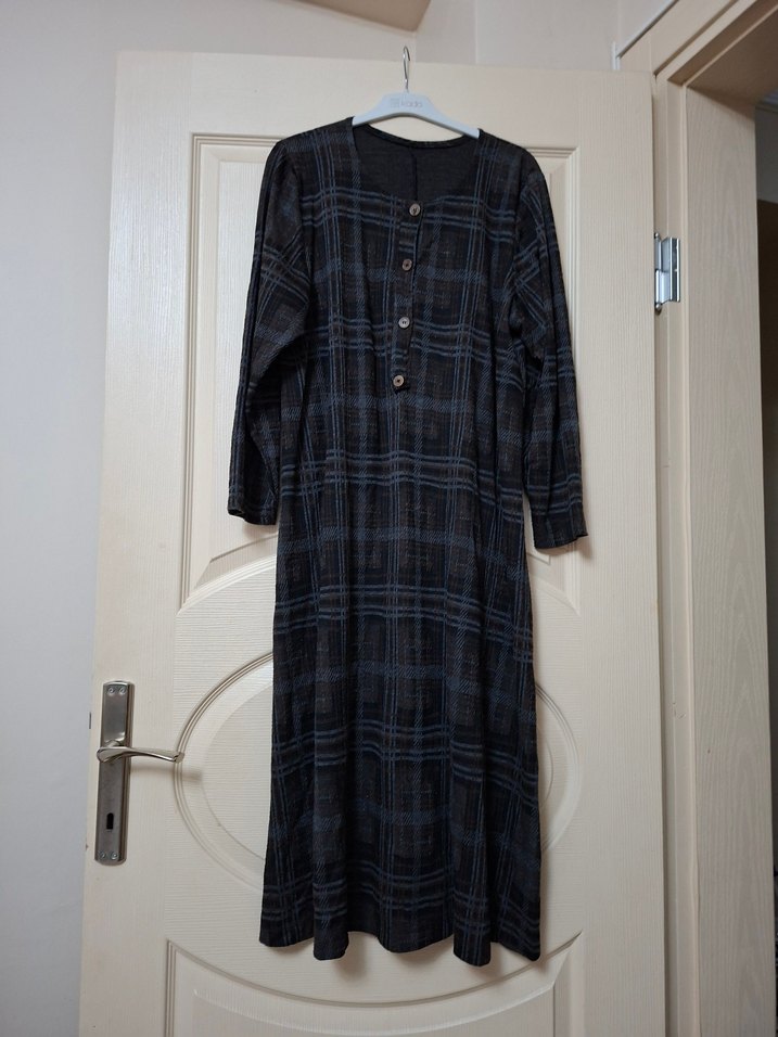 Düğmeli önü ve uzun kollu kışlık tunik Gevşek kesimi ve notched yaka detayı ile sade, günlük kullanıma uygun.ürün temiz kullanılmıştır hiçbir kusuru yoktur iki koltuk altı 58 cm omuzdan aşağıya boyu 112 cm dir