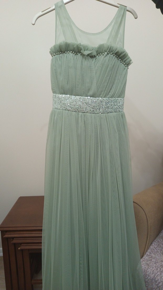bir defa 2 saat giyildi sorunsuz. vücuda oturan abiye elbise askısız yakaya ve piliseli tasarıma sahiptir. Yumuşak haki renginde, kolsuz kesimlidir ve ışıltılı taşlı beliyle göz alıcı bir dokunuş sunar.