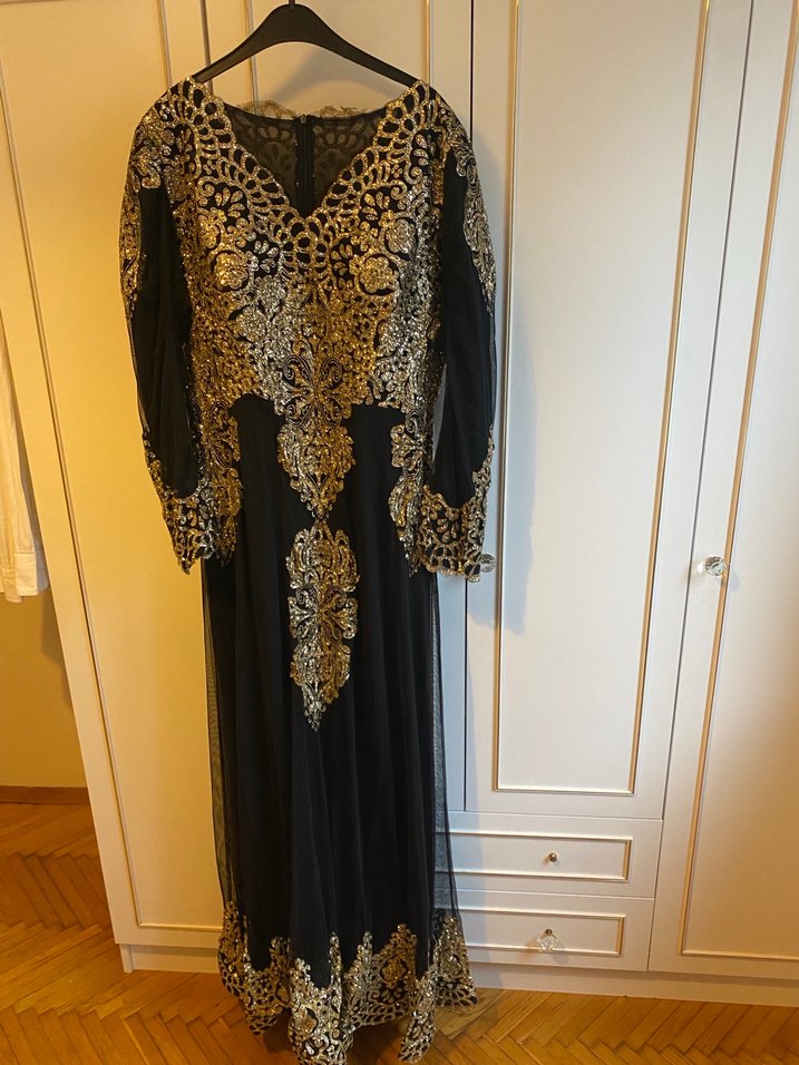 Bu uzun abiye elbise, koyu altın desenleri, drapeli tasarımı ve V yakası ile dikkat çeker. Uzun kollu ve bol kesimdir, klasik şıklık ve bohem tarzı birleştirir. Düğün için uygundur. ✨Göğüs kaplı etek uçları dahil iş ve pul detaylı sadece bir kez sünnet annesi giydi.Tesettüre de uygundur.İç kolları dolapta beklediği ve işlemelere değdiğinden hafif tüketme var siyah ve kol iç kısmında kaldığından fazla belirgin değil.Üst tamamen tül üzerine işlemeli alt astarlı etek volanlı geliyor iki kol arası 50 boy 155 omuzdan eteğe kadar.Bel esneterek 46 cm 42-48 bedene kadar uygundur.pazarlık payı vardır İzmir Altan mağazasından alındı