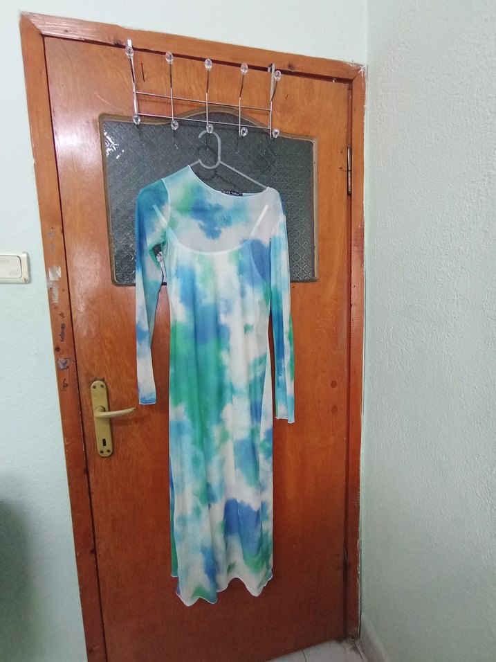 Bu uzun kol, kruvaze yaka ve bağlama desenli elbise, yumuşak sentetik kumaştan olup bohem tarzını yansıtır. Drapeli ve vücuda oturan kesimdedir.