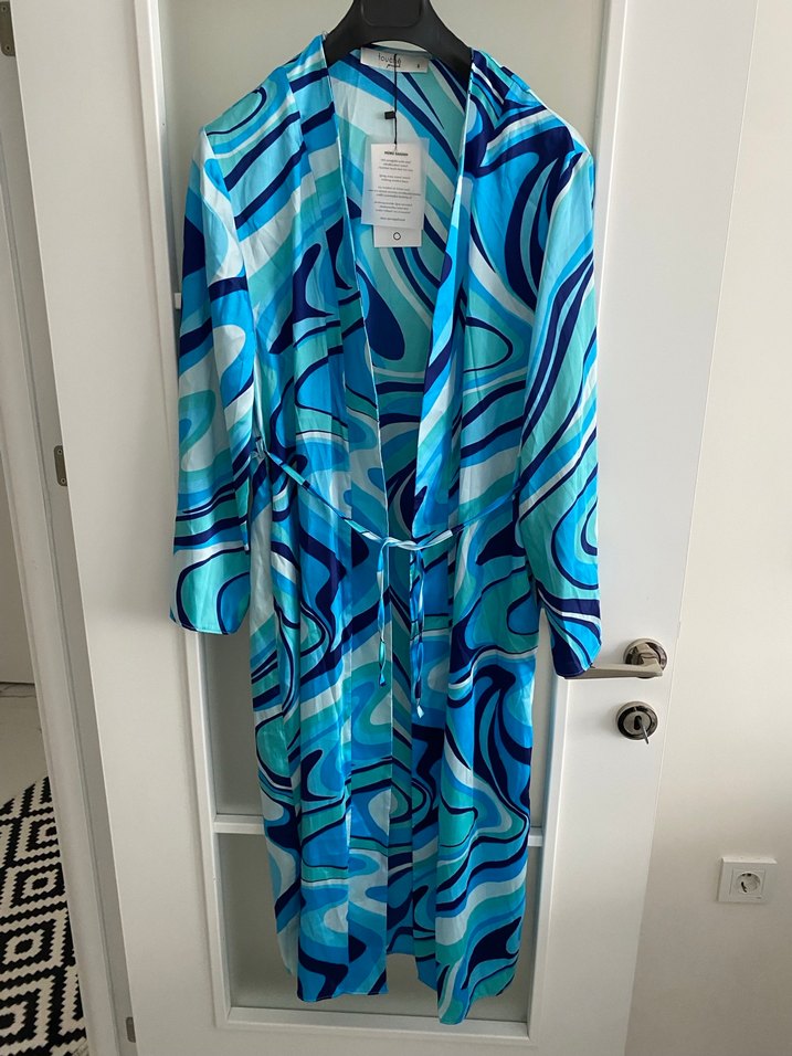 Kadınlar için uzun kollu, bol kesim ve uzun boyda kimono. Açık mavi bağlama desenli, çağdaş bohem tarzda tasarlanmıştır. Rahat bir görünüm sunar.