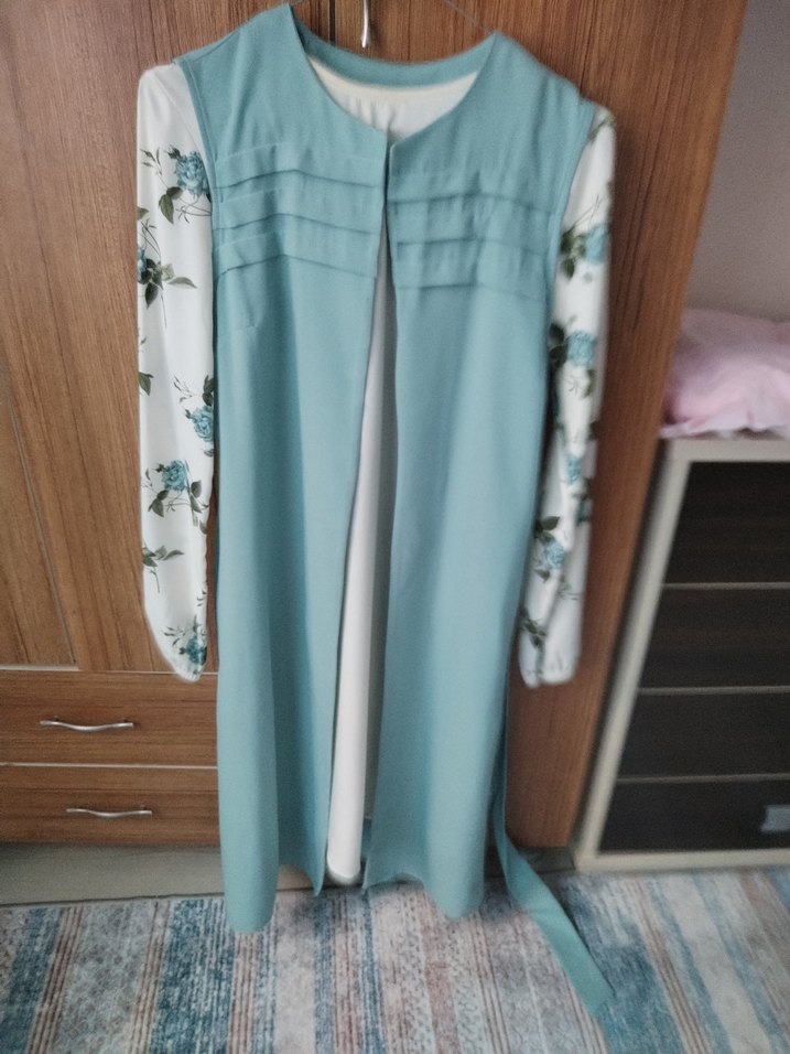 Uzun kol ve çiçek desenli baskılı, turkuaz drapeli uzun kadın elbisesi. Yuvarlak yaka ve regular kesim, sentetik kumaştan, günlük kullanıma uygun.