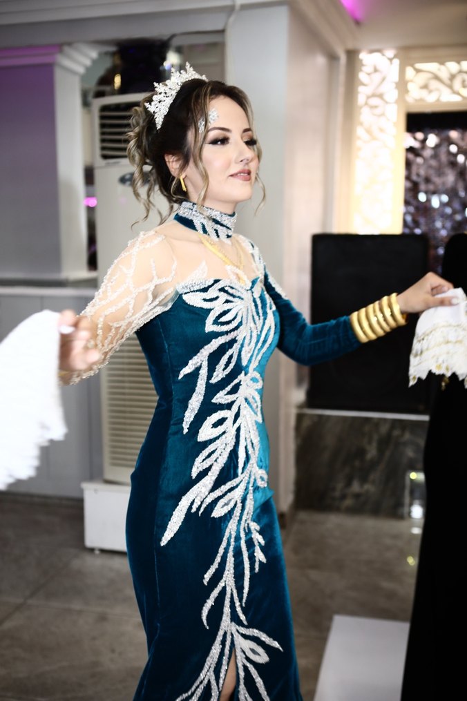 Uzun kollu, straplez yaka, drapeli ve etnik desenli parlak mavi kumaştan yapılmış, dar kesim hint elbisesi, avangart ve geleneksel tarzı birleştirir.Kadifenin üzerine işlenen kumaş , iki tane gelinlik kumaşıdır özenle dikilmiştir