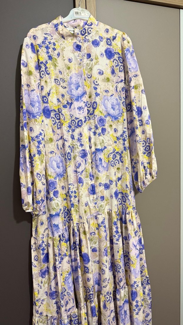 Uzun kollu bohem elbise, pastel çiçek desenli, yüksek yakalı ve fırfır detaylı, yumuşak sentetik kumaştan, bol kesim. Hiç giyilmedi etiketli ürün.