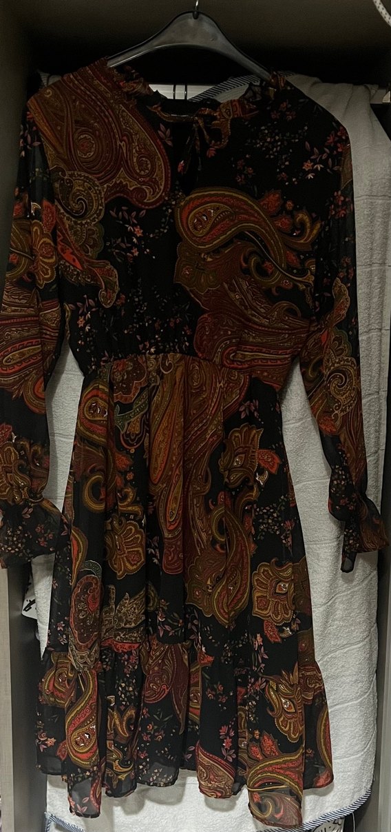 , uzun kollu ve fırfırlı, bol kesim bohem uzun elbise. Koyu çok renkli elbise