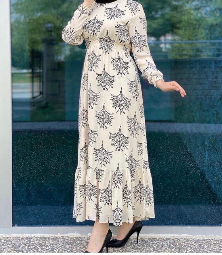 Beyaz renkte, uzun kollu, yüksek yakalı, salaş kesimli, drapeli ve batik desenli uzun elbisedir. Günlük kullanıma uygundur.