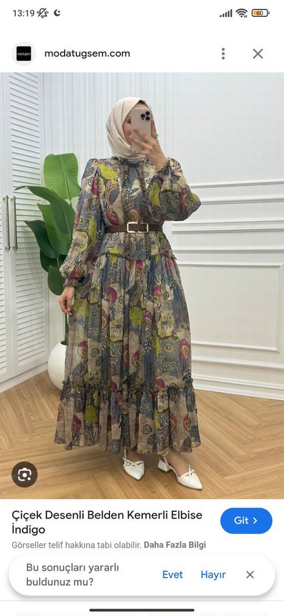 Yüksek yakalı, uzun kollu ve bol kesim bu uzun elbise, gri tonlarında batik desenlidir. Kuşaklı ve yumuşak sentetik kumaştan üretilmiştir, günlük kullanıma uygundur.