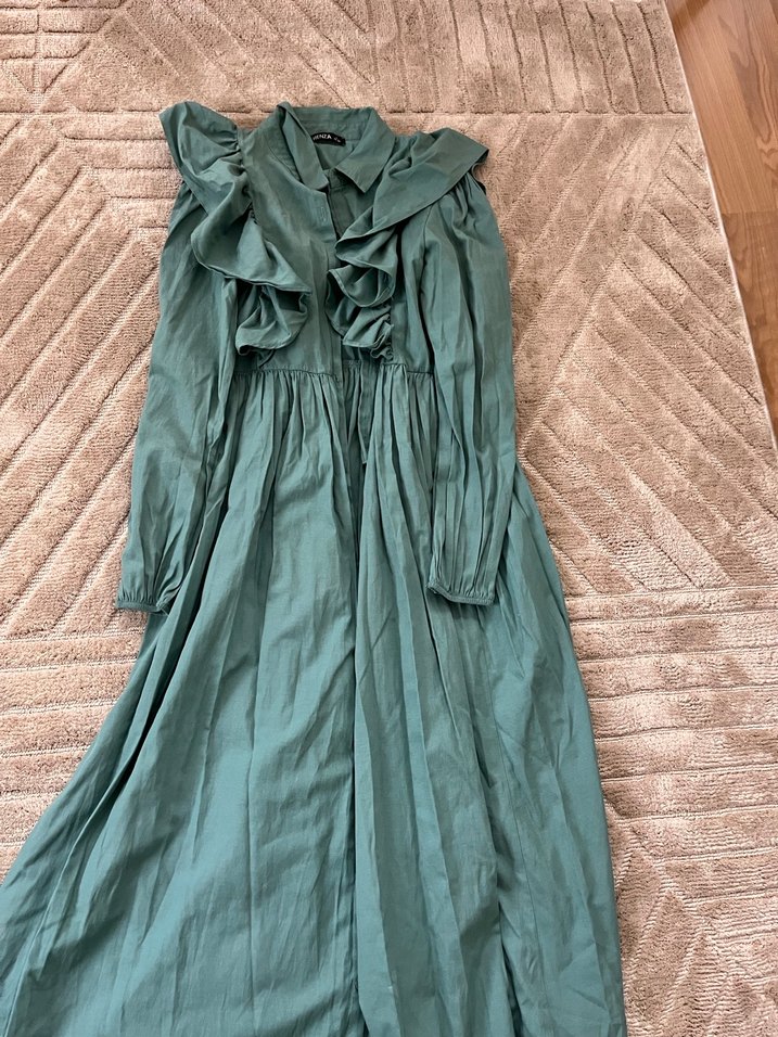 Bu uzun turkuaz elbise, bol kesim ve drapeli detaylarla yüksek yakaya sahip, yumuşak keten kumaştan yapılmıştır, bohem tarzındadır.