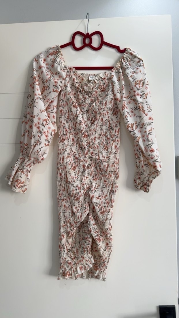 Uzun kollu, V yaka ve drapeli tasarıma sahip, hafif sentetik kumaştan yapılmış, ince çiçek desenli, bohem tarzda günlük kullanıma uygun dar kesim elbise.