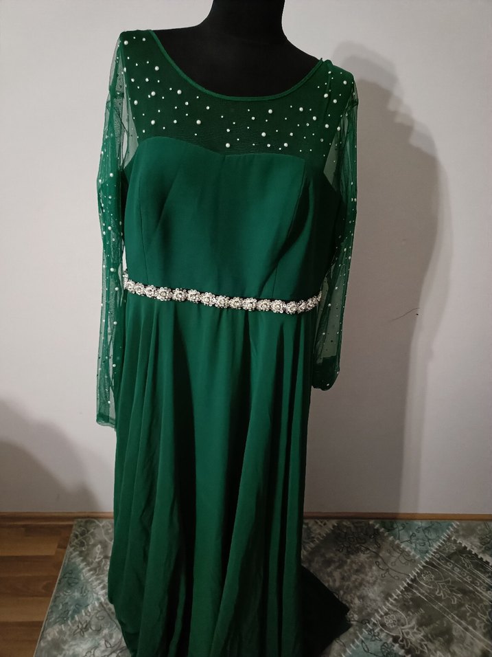 Uzun kol ve yuvarlak yakalı, boncuk işlemeli yeşil abiye elbise. Şeffaf üst kısım ve kollarda boncuk detayları bulunur, belinde süslü kemer vardır. Parlak görünümü ve bohem tarzıyla düğünlere uygundur.