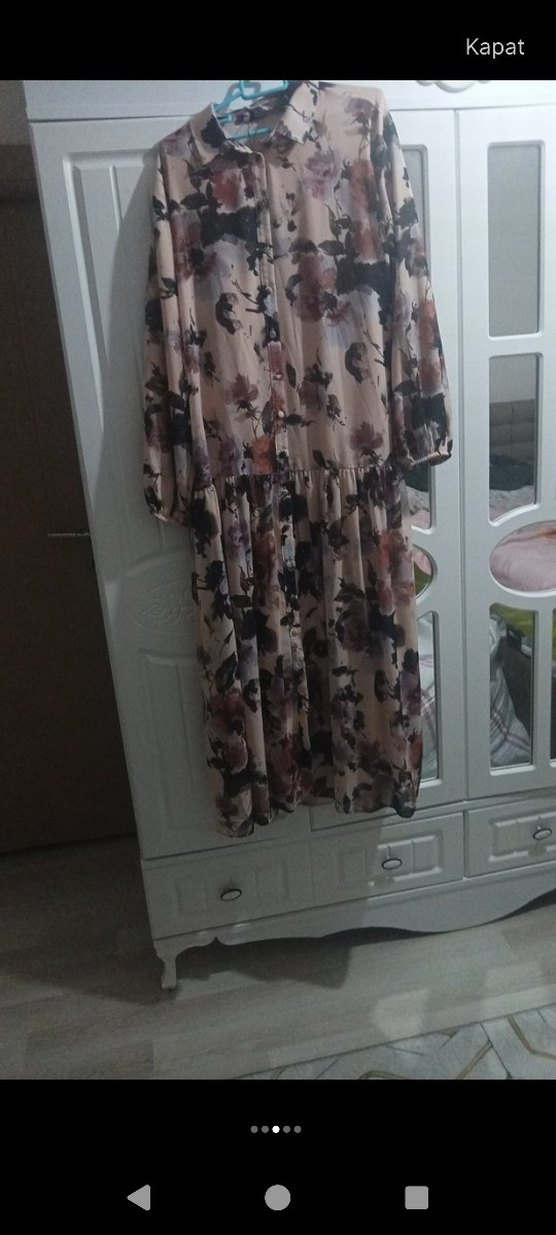 Açık pembe, uzun kollu, düğmeli ön detaylı, bol kesim ve çiçekli batik desenli bohem tarzı elbise.