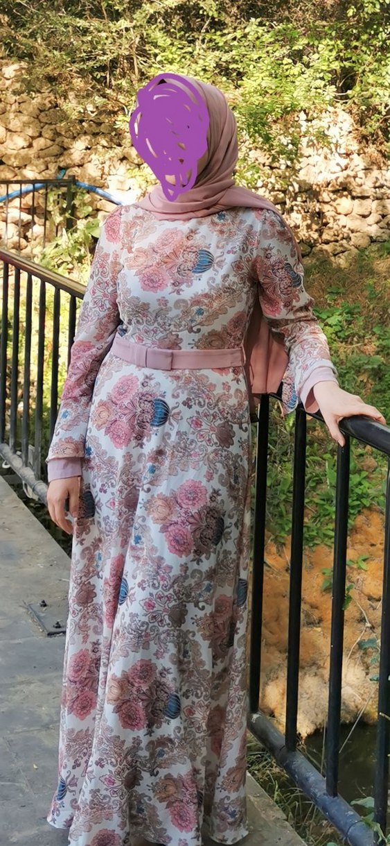 Yumuşak sentetik kumaştan üretilmiş, yüksek yakalı ve uzun kollu, drapeli, pastel pembe çiçek desenli, bohem tarzda, modest kesim uzun elbise. Yakından fotoğraf atabilirim