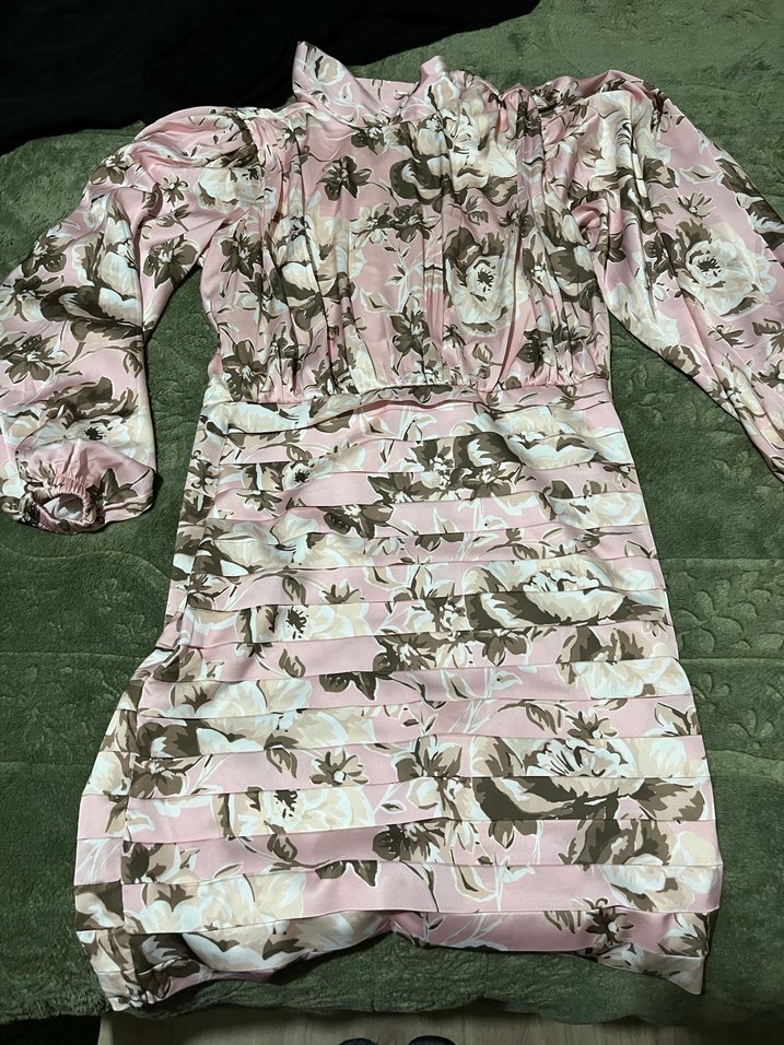 Pembe zemin üzerine çiçek desenli, uzun kollu ve vücuda oturan, Paris tarzı sokak modasını yansıtan kadın elbisesi. Kullanılmadı s m uyumlu