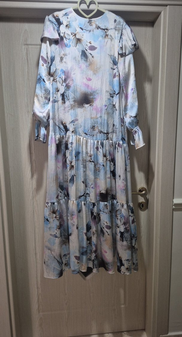 Uzun, bol kesim bohem elbise, tekne yaka ve volanlı uzun kollara sahiptir. Çok renkli batik desenli yumuşak sentetik kumaştan yapılmıştır.