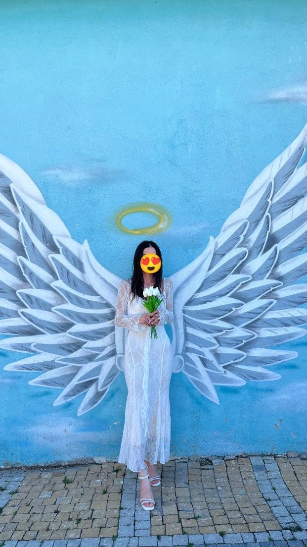V yakalı, uzun kollu, transparan kumaştan yapılmış, bağlama desenli, beyaz ve dar kesim gelinlik. Bohem ve retro tarzları bir araya getirir.