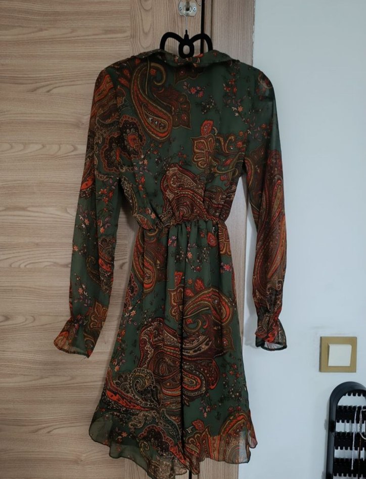 Uzun kollu, bol kesim bohem elbise, koyu renkli desenli kumaş, yüksek yaka ve beli vurgulayan kemer ile. Romantik akşamlar için ideal.