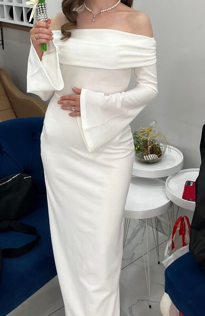 Uzun Kol Detaylı Beyaz Düz Gelinlik