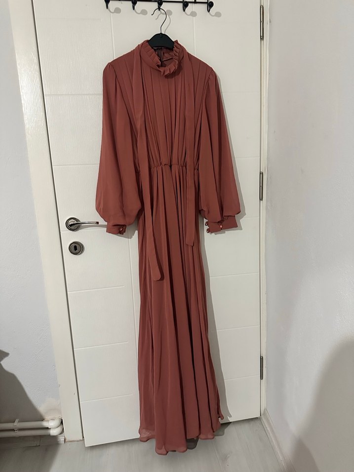 Bu uzun elbise, bol kesim ve drapeli detaylara sahiptir. Yüksek yakalı ve ipeksi kumaştan yapılmış koyu bej rengindedir. Minimalist, modern klasik tarzda, uzun kolludur. Özel günler için uygun, kemerlidir , 1 kez giyildi yeni gibi