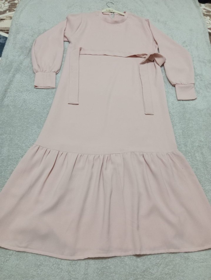 Uzun, salaş kesim kadın elbise; uzun kollu, yuvarlak yaka ve etek ucunda fırfır detayına sahiptir. Yumuşak pastel bej renkte, rahat ve sade gündelik kullanıma uygundur.