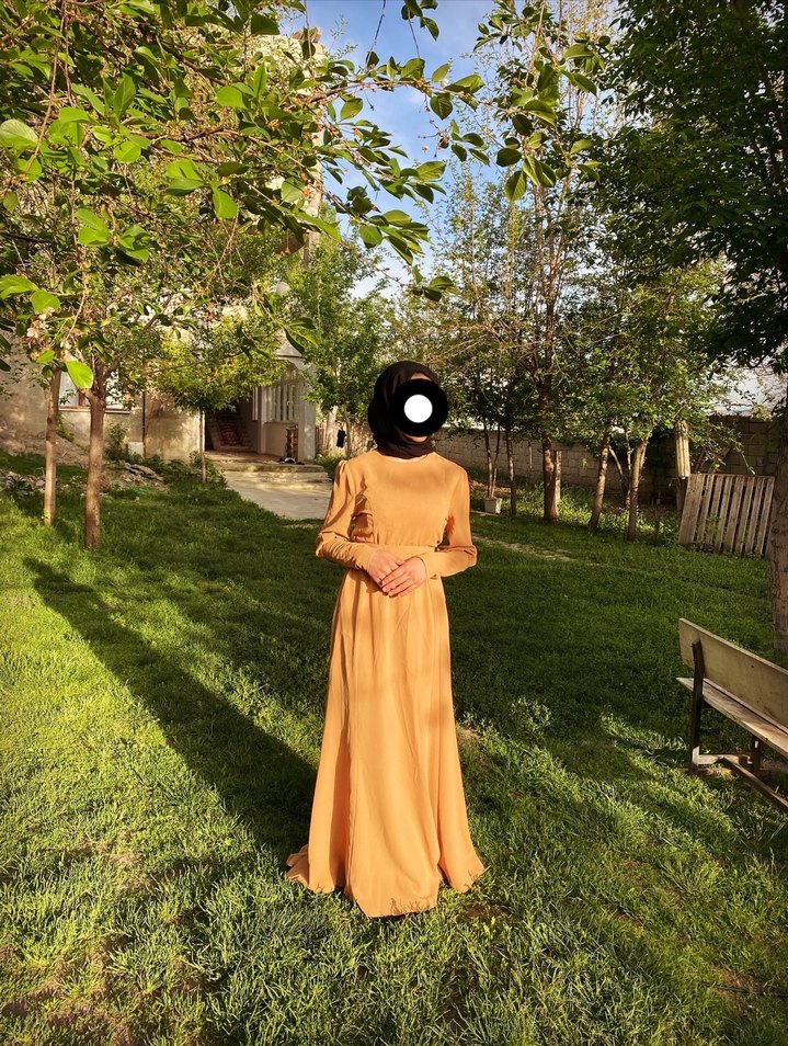 Uzun kol, yüksek yakalı ve drapeli kesime sahip camel renkli elbise, salaş ve sade tasarımıyla düğünler için uygundur.