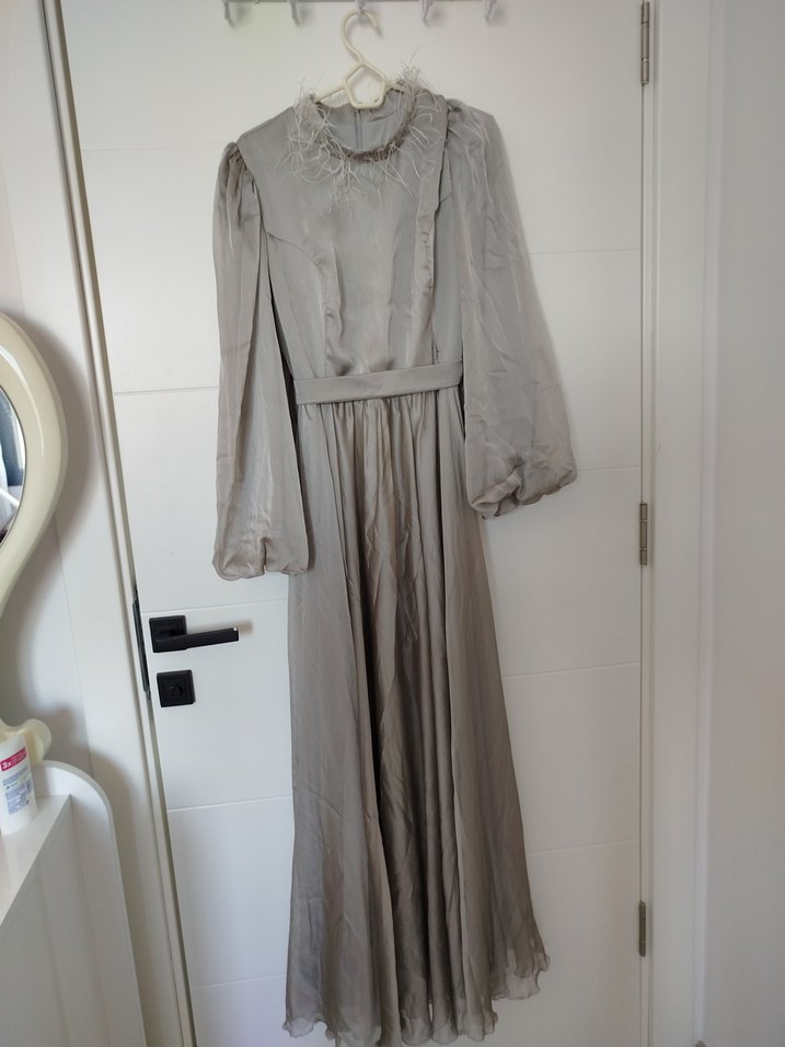 Bu uzun bej elbise, drapeli detaylar, yüksek yaka ve uzun kollara sahiptir. Bol kesimi ve yumuşak akışkan kumaşıyla düğünler için uygundur.