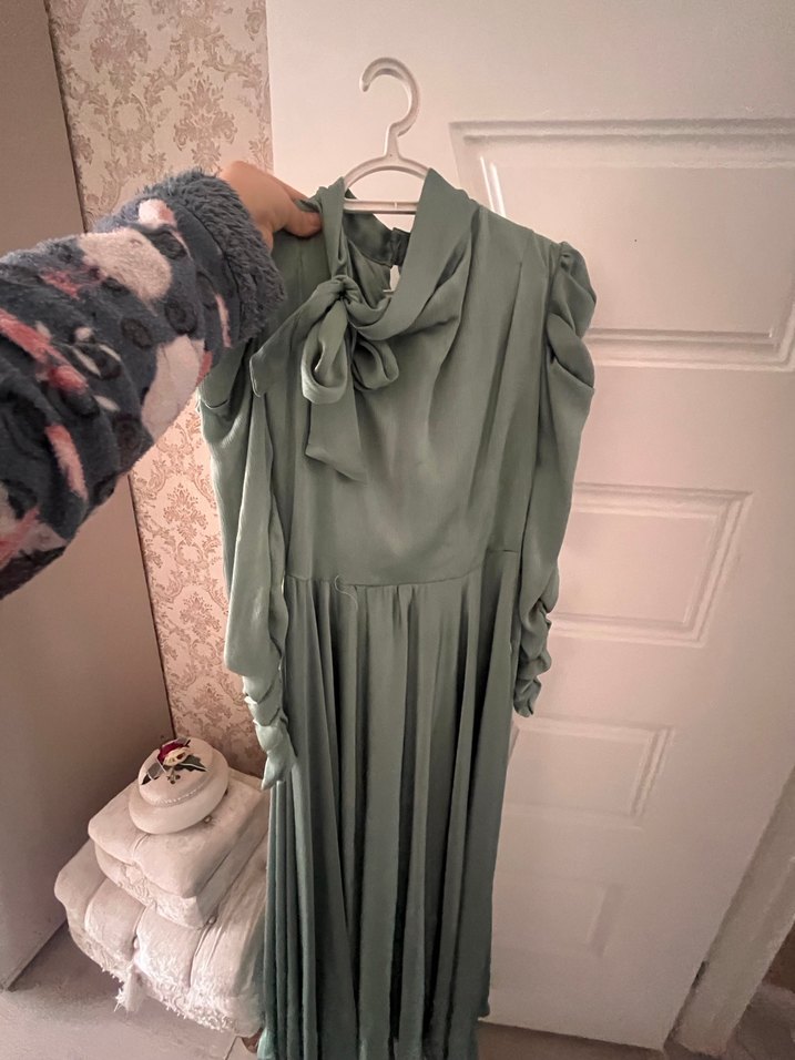 Yüksek yakalı, uzun kollu ve drapeli tasarıma sahip uzun, bol kesim elbise. İpek gibi dokusu ve haki gri tonuyla bohem stil sunar abiyedir