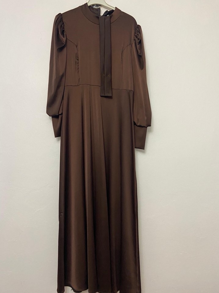 Yüksek yakalı, uzun kollu kahverengi uzun elbise, ipeksi kumaştan ve drapeli tasarımla. Ofis için uygun, düzenli kesim ve sade klasik stil sunar.