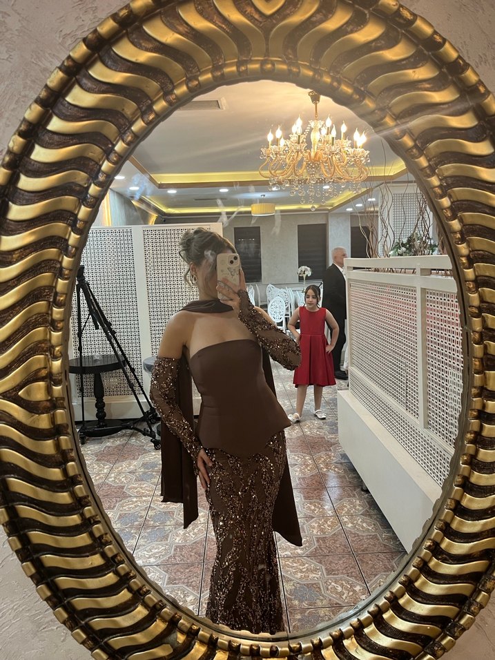 Bu kahverengi uzun elbise, straplez yakalı ve uzun, desenli drapeli kollara sahip. Avant-garde ve streetwear tarzını harmanlar. Parti için uygun. 4 saatliğine giyildi 1 kere giyildi yeni alındı yeni moda
