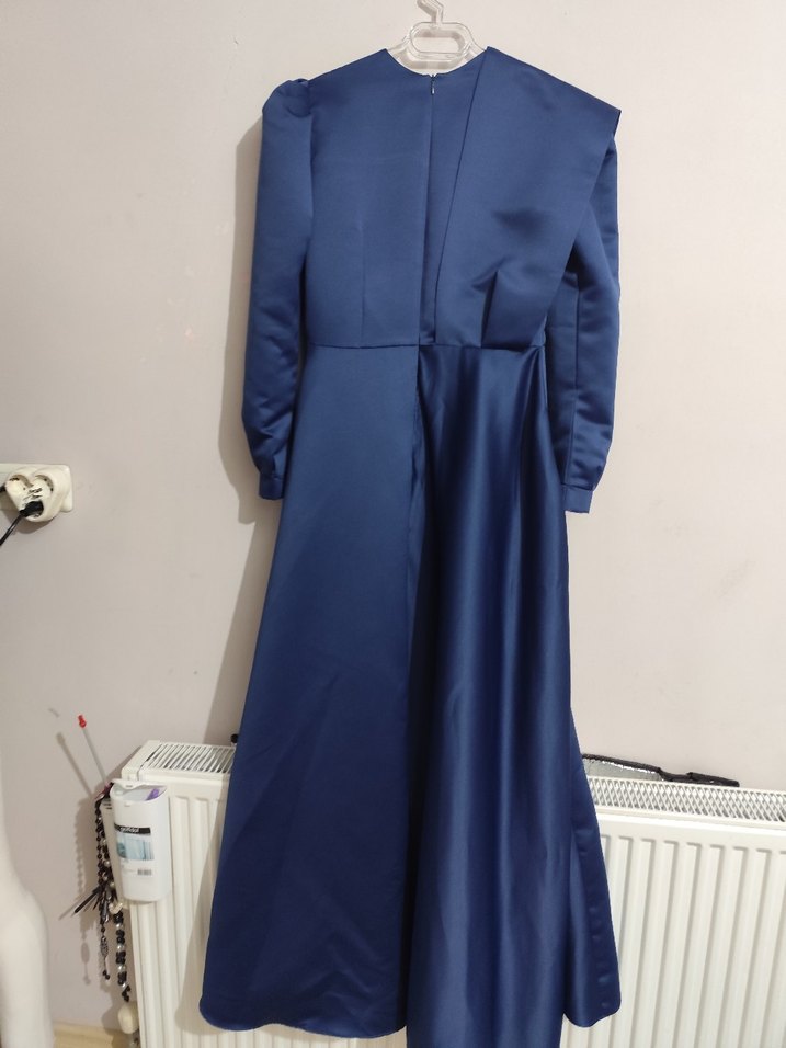 Uzun kol ve yüksek yakalı, koyu mavi kadın elbisesi, drapeli tasarımıyla klasik ve avangart bir görünüm sunar, Kına ve. gece için uygundur. Boy=145. Göğüs = 45. Bel 38cm.
