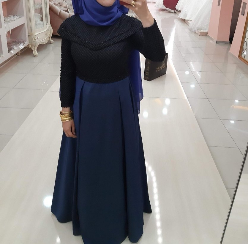 Uzun kollu, yüksek yakalı, drapeli ve desenli lacivert abiye elbise, şık ve gösterişli bir tasarıma sahiptir. ✨