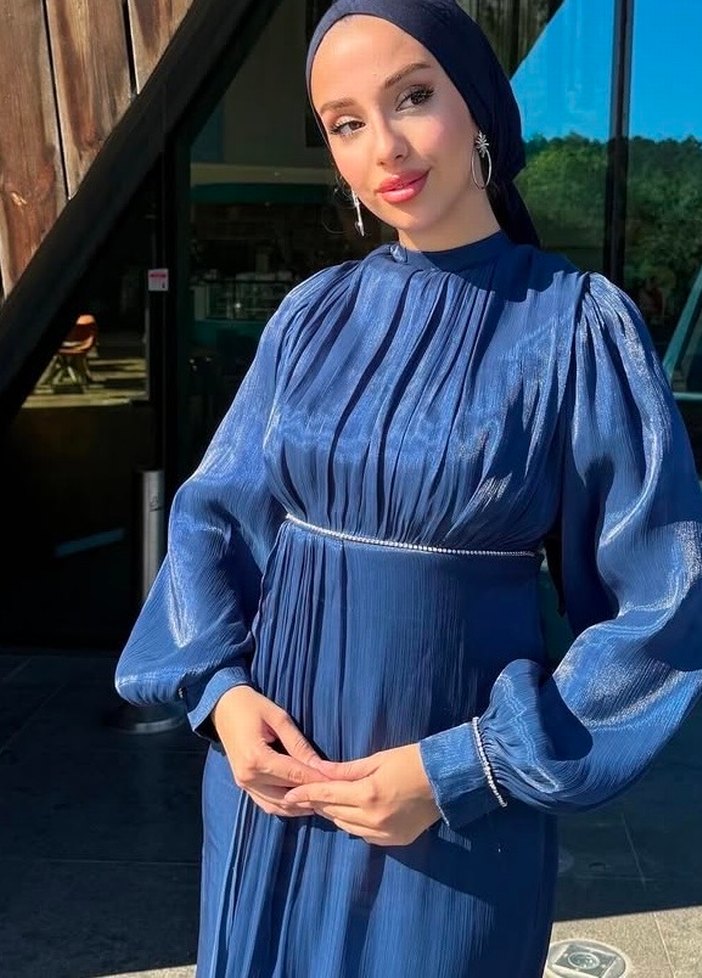Uzun Kol Drapeli Lacivert Kadın Abiye Elbise