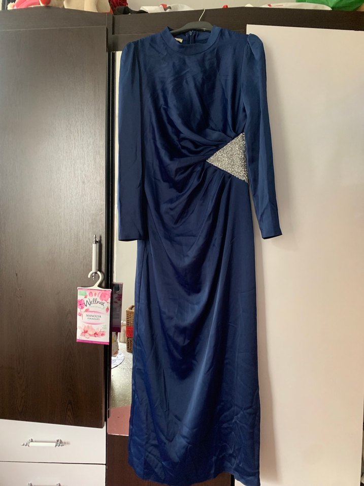 Uzun kollu, yüksek yakalı ve vücuda oturan lacivert abiye elbise, drapeli detaylar ve belde zarif süslemeye sahiptir. Minimalist ve şık tasarım, düğün için uygundur. Sadece 1 kez giydim. Hiç bir deformesi yoktur 0 gibidir. Bir butikten almıştım. Ütüm olmadığı için ütüsüz kırışık duruyor. Yoksa çok güzel sateni ipek gibi duruyor