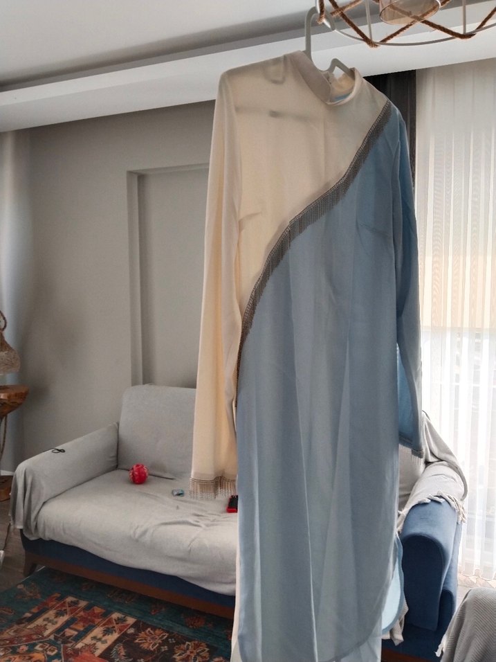 Uzun, bol kesim tunik yüksek yakalı ve uzun kolludur. Açık mavi ve bej renklerin drapeli tasarımı minimalist bir görünüm sunar. Yumuşak sentetik kumaştan, günlük kullanıma uygundur. üründe hiçbir problem yok bir kere giyildi temiz önünde ve kollarında zincir detayı vardır ön boy 100 santim arka boy 115 santimdir