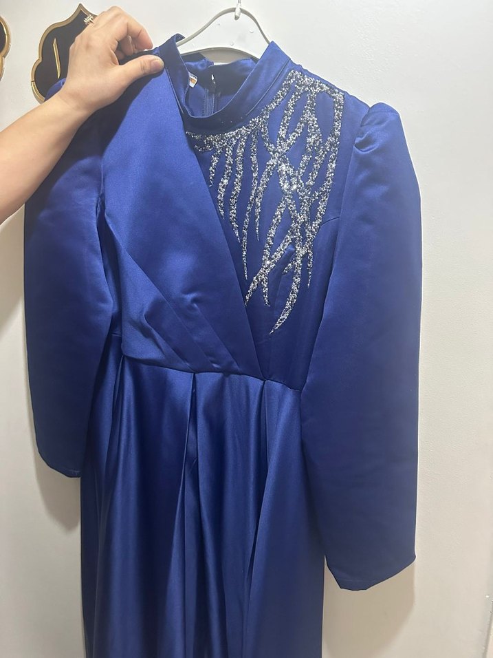 Yüksek yakalı, uzun kollu mavi abiye elbise, drapeli ve parlak işlemeli detaylara sahiptir. Düğünler için uygundur.