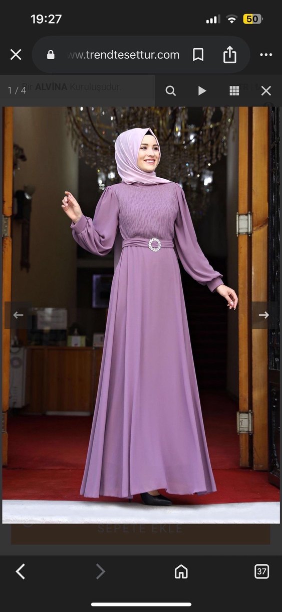 Uzun kol ve yüksek yakalı, mor renkte bol kesim drapeli abiye elbise. Belde kemer detayı vardır, düğünler için uygundur.