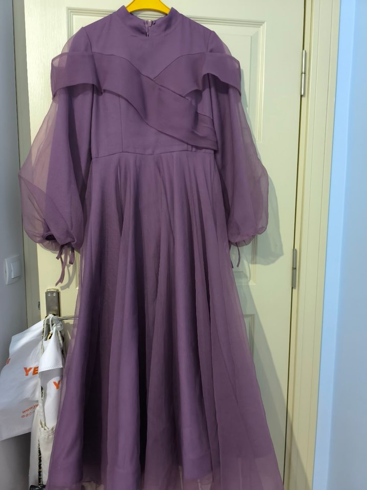 Yüksek yakalı, uzun kollu ve drapeli detaylı uzun mor abiye elbise. Gevşek kesimi ve modern klasik tarzıyla düğünler için uygundur. Desensiz ve avangart tarzda tasarlanmıştır. Arkasında kemeri vardır. 1 kere giyildi. Hiçbir defosu yoktur