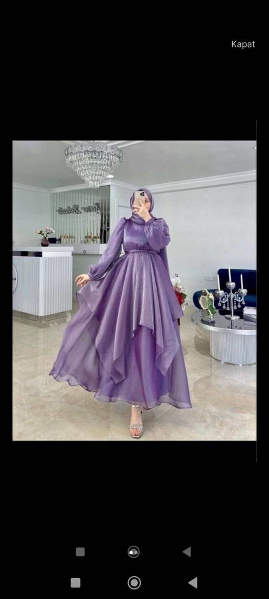 Drapeli, uzun kollu ve yüksek yakalı mor abiye elbise. Bol kesimi ve pastel tie-dye deseni ile düğünlere uygundur.